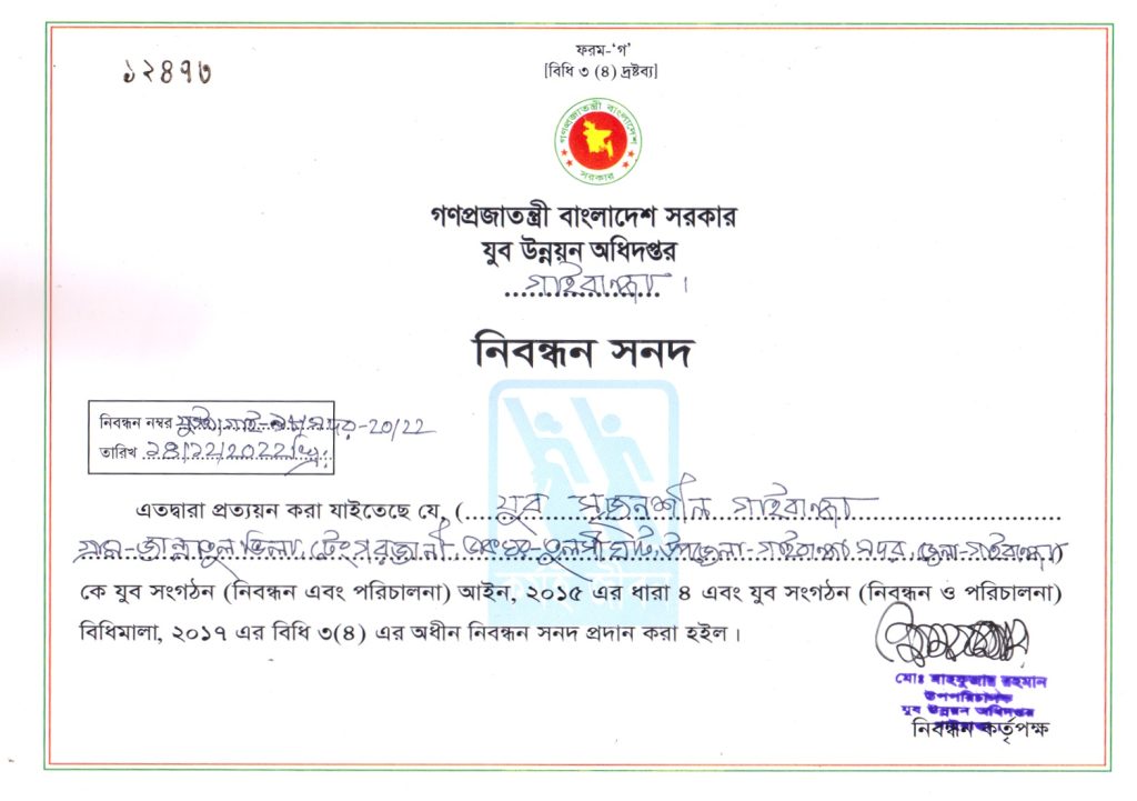 According to Md. Mahfuzur Rahman, the organization, located in Tengorjani village of Ballomjhar Union, under Gaibandha Sadar Upazila, received its registration under Section 4 of the Youth Organization (Registration and Operation) Act, 2015 and Rule 3(4) of the Youth Organization (Registration and Operation) Rules, 2017.