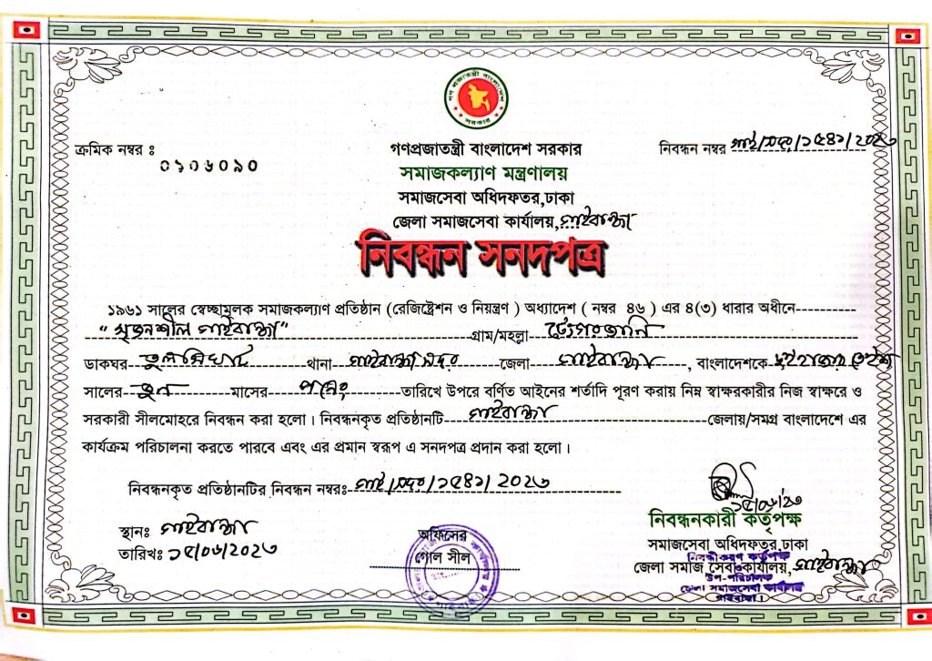 “Srijonshil Gaibandha”, a community-based organization located in Tengorjani village of Ballomjhar Union, under Gaibandha Sadar Upazila, has officially received its registration certificate from the Department of Social Services, under the Ministry of Social Welfare, Government of the People’s Republic of Bangladesh. The registration number is GAI/Sadar/1541/2023.