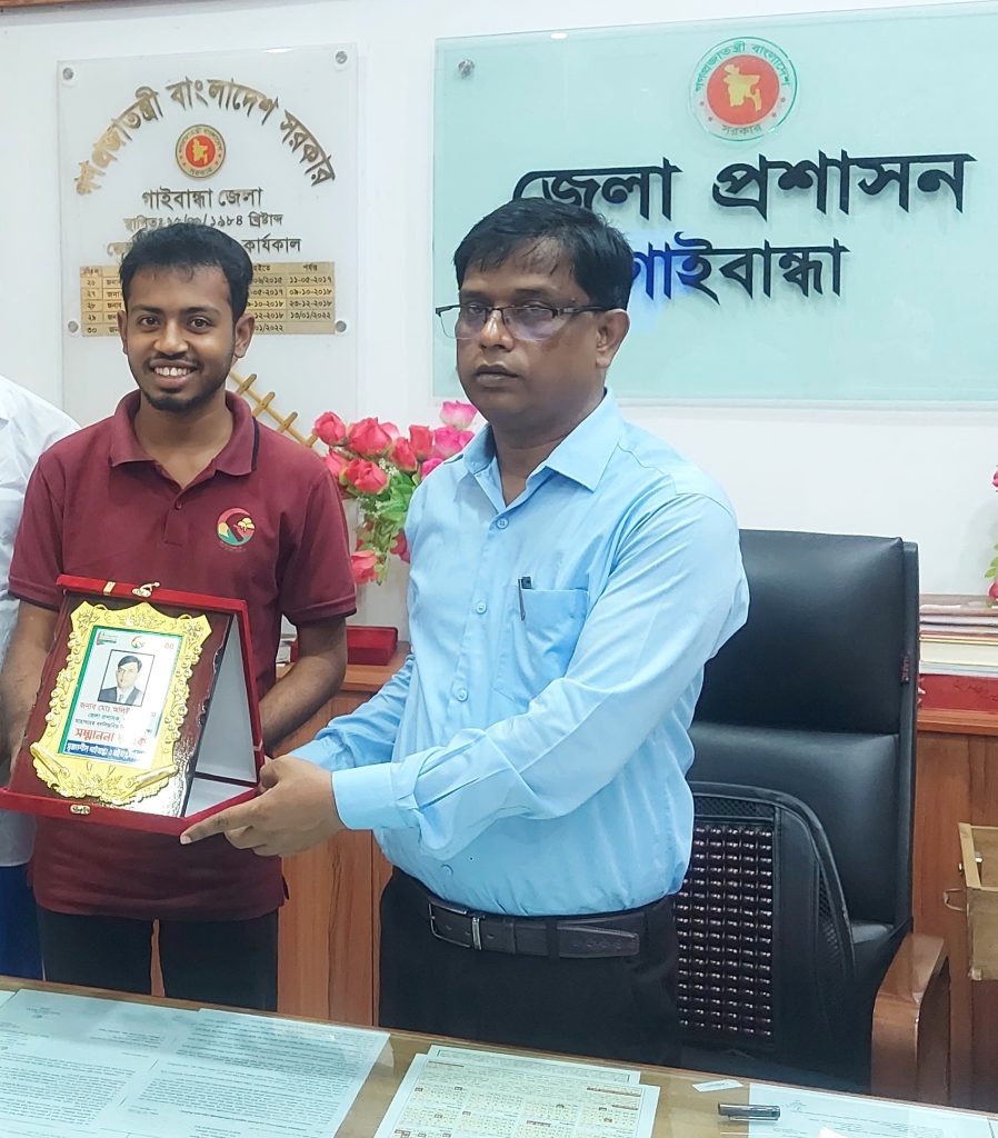 বুধবার (১৯ জুলাই ২০২৩) দুপুর ১২টায় জেলা প্রশাসকের কার্যালয়ে এক অনাড়ম্বর অনুষ্ঠানে এ সম্মাননা তুলে দেওয়া হয়। অনুষ্ঠানে গাইবান্ধা জেলা সমাজসেবা কার্যালয়ের উপপরিচালক মো. ফজলুল হক, সৃজনশীল গাইবান্ধা ও বই ঘর পাঠাগারের সভাপতি মো. মেহেদী হাসান, সাধারণ সম্পাদক মো. তাওহীদ উল ইসলাম সরকার, এবং কোষাধ্যক্ষ মো. নিশাদ বাবু উপস্থিত ছিলেন।