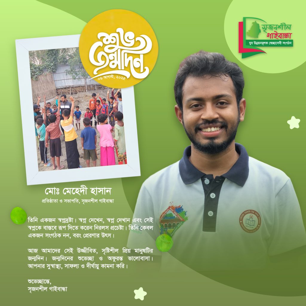 Under his leadership and commitment, Srijonshil Gaibandha has emerged as a progressive youth organization, becoming a beacon of hope for the people of Gaibandha.